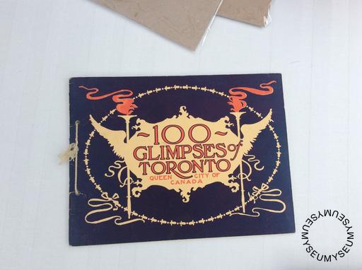 The oldest book '100 Glimpses of Toronto,' is from 1910." The small book, '100 views of Toronto,' is from the 1930s and 1940s.