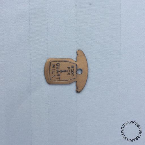 At the time the milk token would be placed in the mouth of empty milk bottles. The bottles were then left for collection on the door step or specially designed cupboards. The front says 'Good for 1 Quart Milk.' The reverse says 'Good for value at which this token sold.' Memento of the past and how times have changed. Services which no longer exisit, era that is gone. How jobs have changed and our expectations - full service gas stations, milk delivery, are things of the past.