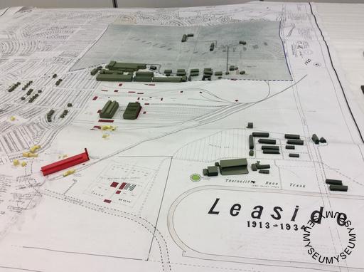 The map is based on two primary eras - Fire Prevention Data of 1924 and 1934. Captures the building data on the maps. The green buildings represent 1924. They consist of the Leaside aerodrome shown in green as hangars, Canada Wire and Cable (provided most of the wire and cable for Toronto), Canadian Northern repair facilities (located in the centre of the industrial area and the Thorncliffe Racetrack (1922-1952) which is on the outskirts of Leaside. The red buildings are the Bayview business section and an inventory of homes from that year. Lastly, the yellow buildings are the original farm buildings of the Leaside farming community.